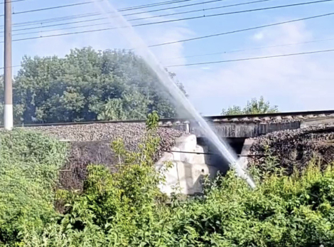 Серьезная коммунальная авария произошла в Октябрьске. На прошлой неделе рядом с мостом в районе АЗС в Костычах прорвало водопроводную трубу. В результате образовался мощный фонтан, который с сильным напором поливает железнодорожные пути и даже на близлежащие дома.