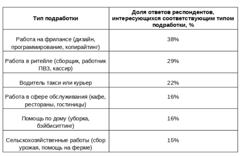 Наиболее привлекательным форматом для летней подработки оказался фриланс - дизайн и программирование. Подработать летом на фрилансе предпочли бы 38% респондентов. Среди других популярных форматов летней подработки оказались работа в ритейле (29%) и занятость в качестве водителя такси или курьера (22%).