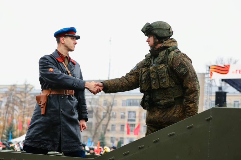 С приветственным словом к участникам обратился Герой Российской Федерации, начальник Главного штаба Всероссийского военно-патриотического общественного движения «ЮНАРМИЯ» Владислав Головин. Он отметил, что сегодня внуки и правнуки участников легендарного парада 1941 года сражаются на передовой с тем же врагом – нацизмом, только в новом обличье. «Подвиги наших предков вдохновляют российских бойцов в зоне специальной военной операции», – подчеркнул Герой России.