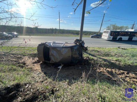 В результате легковушка вылетела на полосу встречного движения и врезалась в бетонный столб, после чего опрокинулась в кювет. Как видно на кадрах, автомобиль изрядно помялся. Кроме того, у него вывернуло колеса.