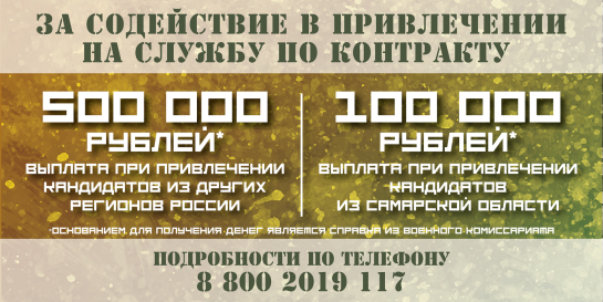 - С 20 февраля она составляет 500 тысяч рублей при привлечении кандидатов из других регионов страны, 100 тысяч рублей при привлечении кандидатов из Самарской области. Основанием для получения денег является справка из военного комиссариата, - пояснили в правительстве.