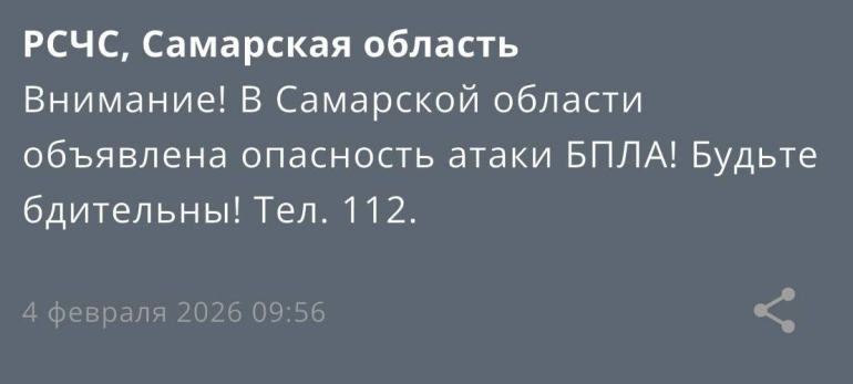 В Самарской области впервые в феврале 2026 года объявили опасность атаки беспилотными летательными аппаратами. Экстренную информацию только что распространил РСЧС.