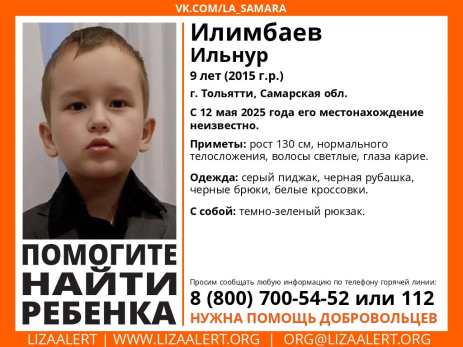 В Самарской области ищут девятилетнего Ильнура Илимбаева. Мальчик пропал 12 мая в городе Тольятти. Ориентировку с приметами пропавшего ребенка только что распространил поисковый отряд «Лиза Алерт».
