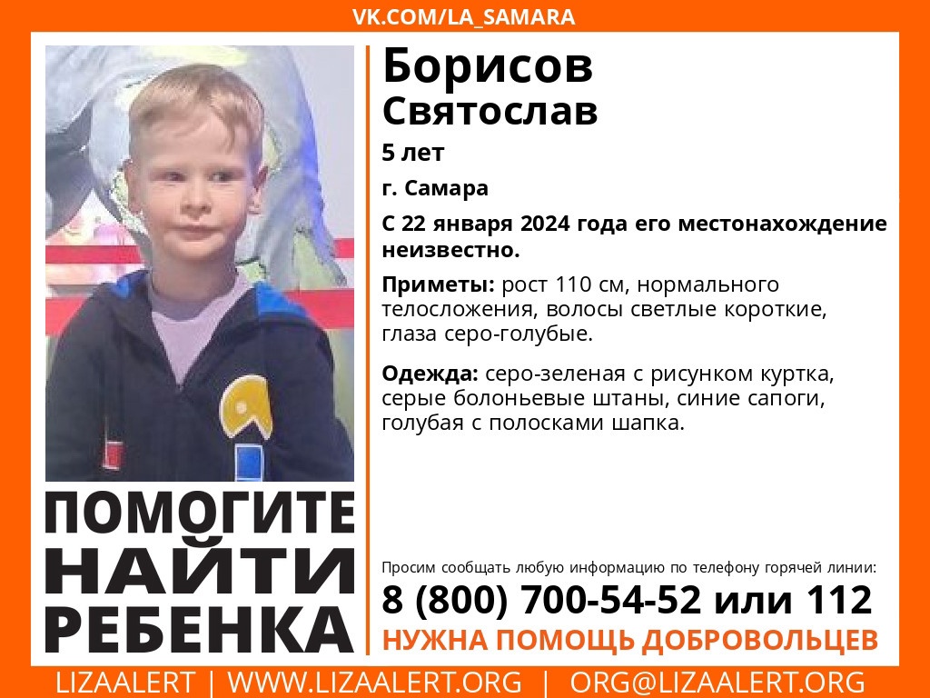 В Самарской области ищут пятилетнего мальчика Святослава Борисова. Ребенок пропал в понедельник, 22 января в областной столице. О его поисках вечером в понедельник сообщили в поисковом отряде «Лиза Алерт».