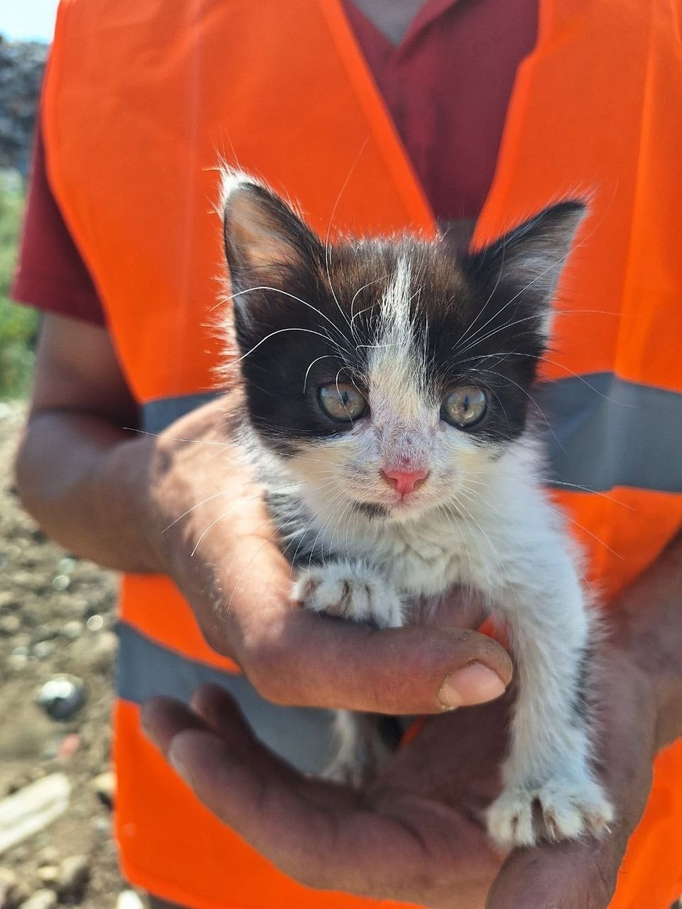 Испуганного малыша заметил во время работы на свалке водитель погрузчика. Животное оказалось в ловушке между обломками старых досок и не могло выбраться самостоятельно. Мужчина аккуратно освободил котенка и внимательно его осмотрел - к счастью, серьезных травм у него не было, только страх в глазах и немного грязи на шерсти.