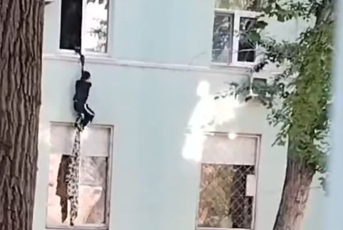 На кадрах видно, как готовые веревки из простыней уже висят из окна. На подоконнике появляется юная самарчанка и аккуратно начинает спускаться вниз. В середине пути она останавливается, разворачивается и показывает какой-то жест в сторону подруги, которая в это время также с улицы снимает весь процесс. После этого школьница приземляется, где к ней подходит подружка-оператор.