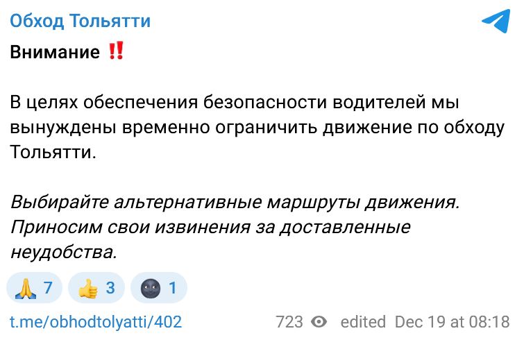 - В целях обеспечения безопасности водителей мы вынуждены временно ограничить движение по обходу Тольятти, - говорится в сообщении.