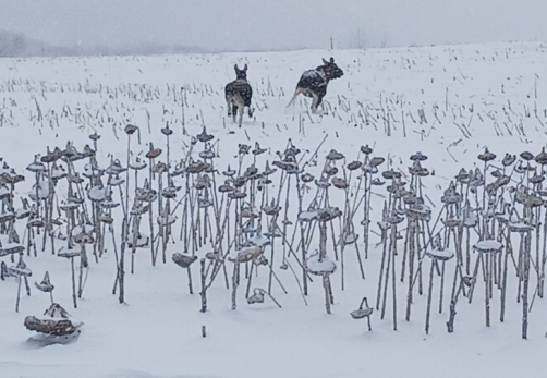 На фото видно, что подсолнечник, который остался на поле после уборочной компании, привлек внимание диких животных. Лоси поедали семена и чувствовали себя комфортно.