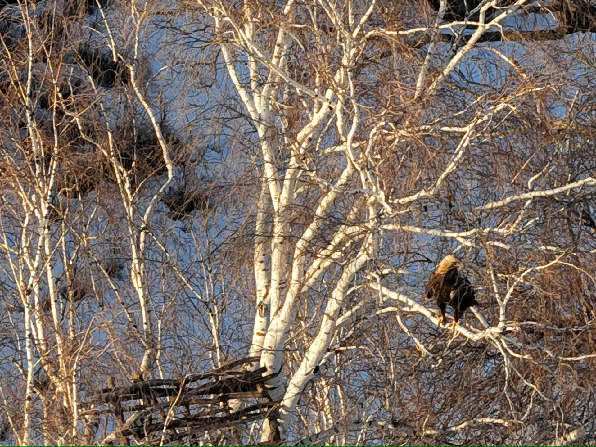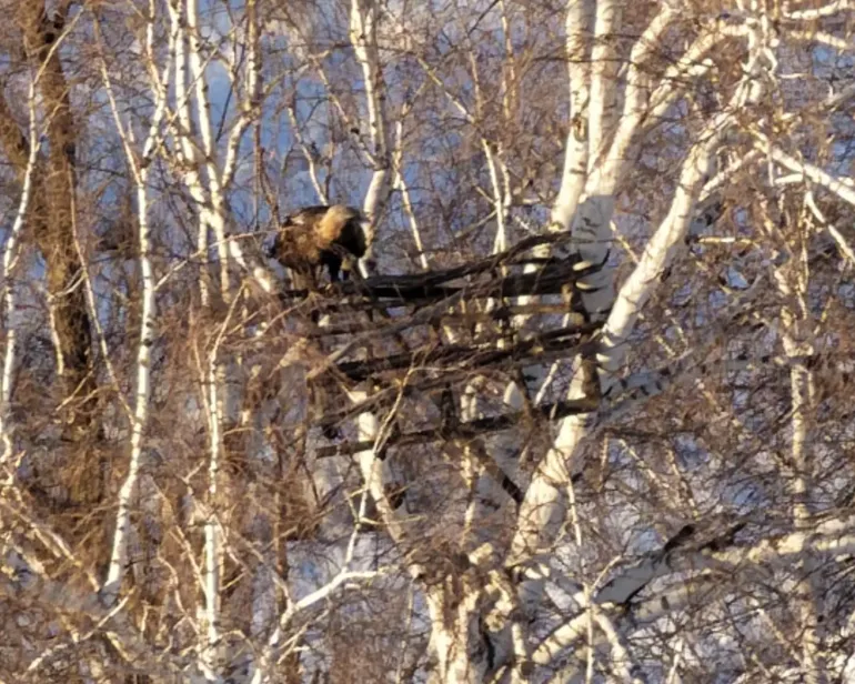 Одну из птиц уже заметили у Алтай-горы в Красноярском районе. Орел отдыхал на специальной гнездовой платформе, которую природоохранные специалисты установили еще в 2012 году для императорских орлов.