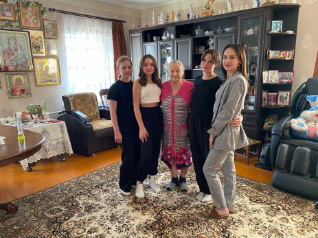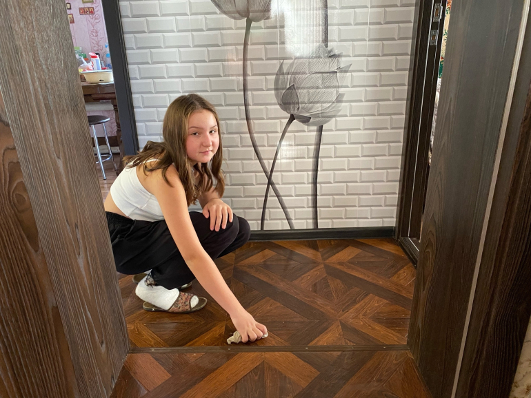 Сабина Алиева, Арина Артамонова, Юлия Кудрявцева и Диана Куликова провели влажную уборку в доме сызранки. Девушки помыли полы и почистили мебель. В знак благодарности хозяйка дома напоила волонтеров горячим чаем со сладостями.