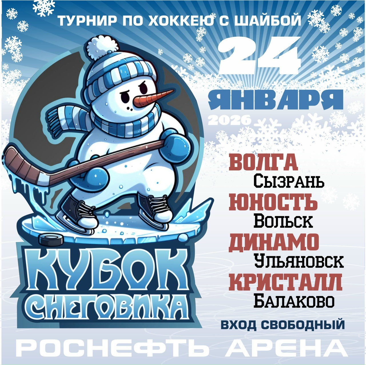 Все игры турнира «Кубок Снеговика» будут проходить в субботу, 24 января, в ледовом дворце спорта «Роснефть Арена». Вход - свободный.