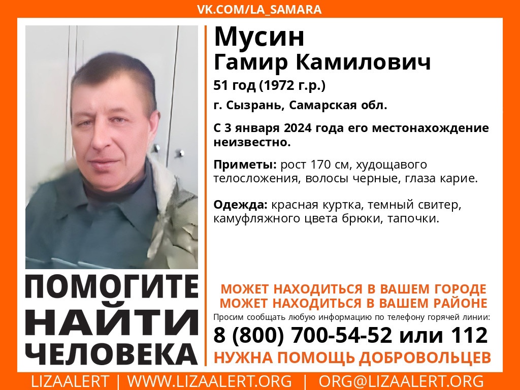 В Самарской области ищут 51-летнего Гамира Камиловича Мусина. Мужчина бесследно исчез в среду, 3 января 2024 года в городе Сызрани. О его поисках сообщили в поисковом отряде «Лиза Алерт».