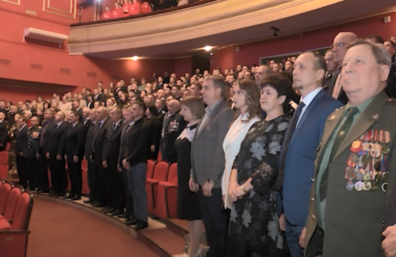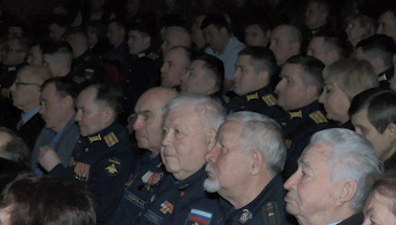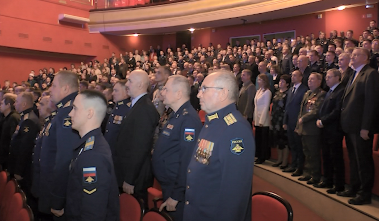 Торжественное собрание в драматическом театре началось с внесения знамен Сызранского гарнизона и вертолетного училища и гимна России, который зал исполнял стоя.