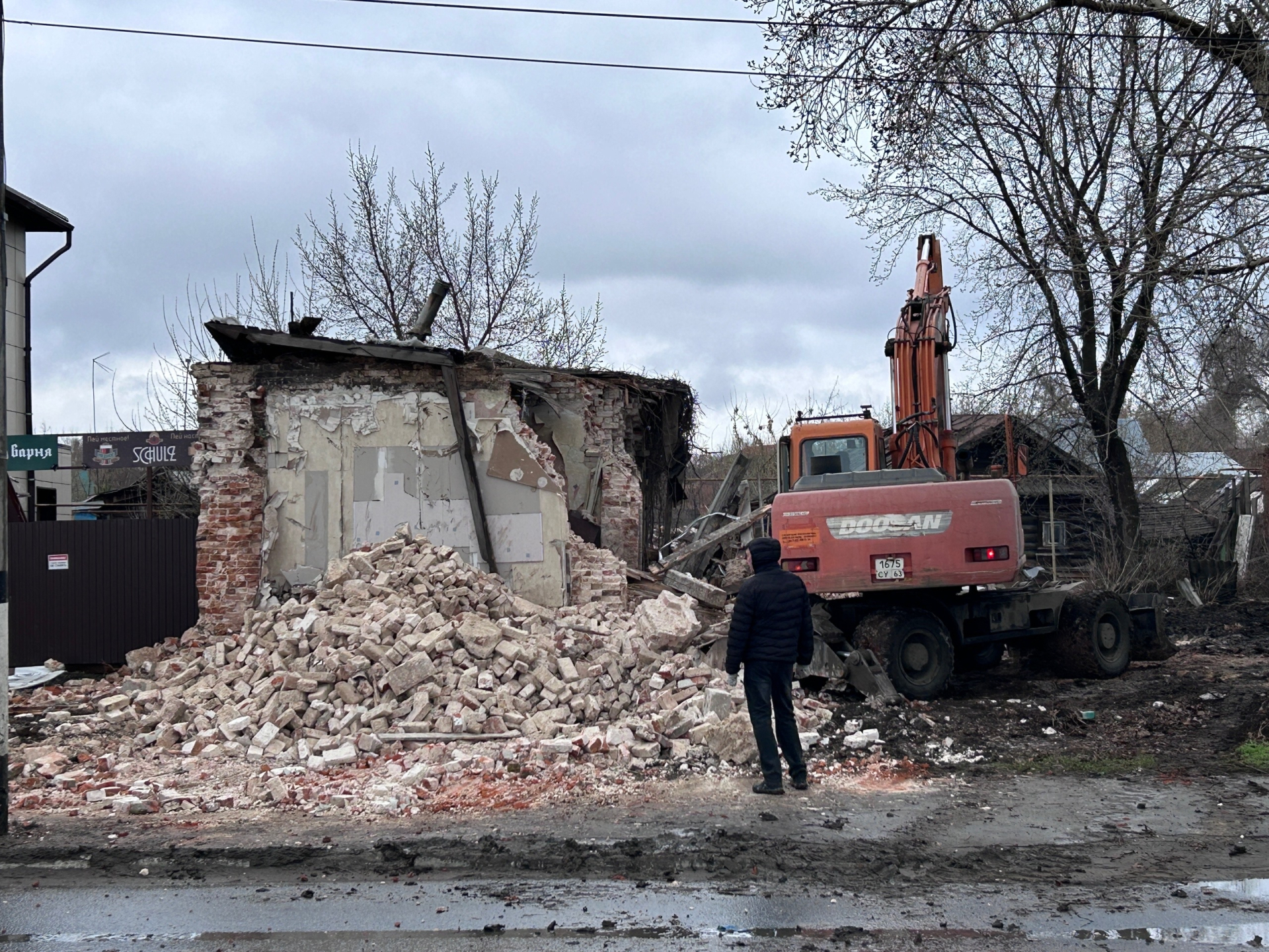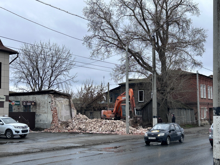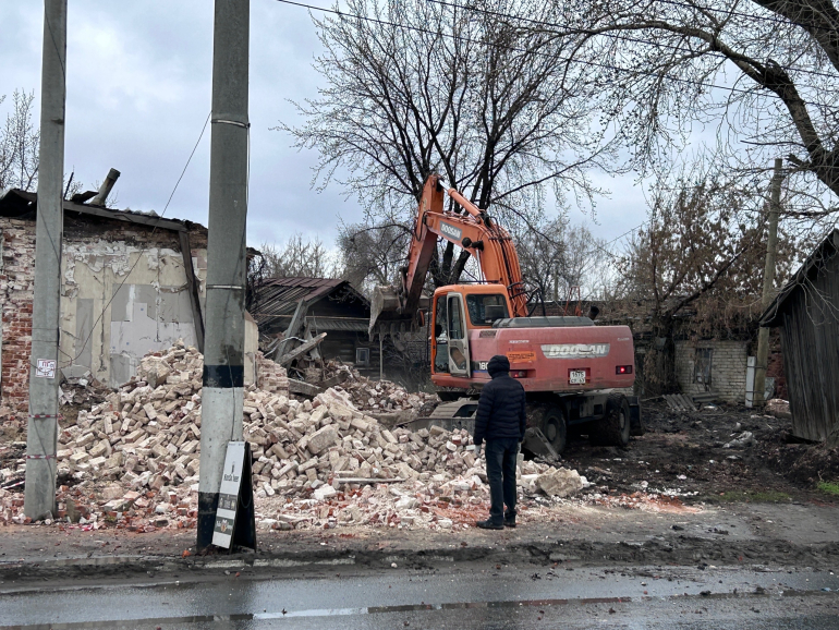 9 апреля на улице Набережная, неподалеку от монастыря, была замечена тяжелая техника: экскаватор планомерно разрушал кирпичный дом № 27А, расположенный между «Домом Свадьбы» и двухэтажным многоквартирным жилым домом.