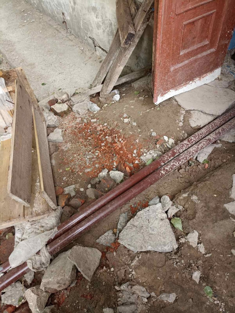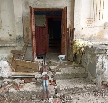 Крыльцо внутри насыпное, из земли, поэтому, когда ремонтники сломали бетонную облицовку, крыльцо прекратилось в буерак. Вдобавок здесь оставили доски, камни, стекловату, куски кирпичей.