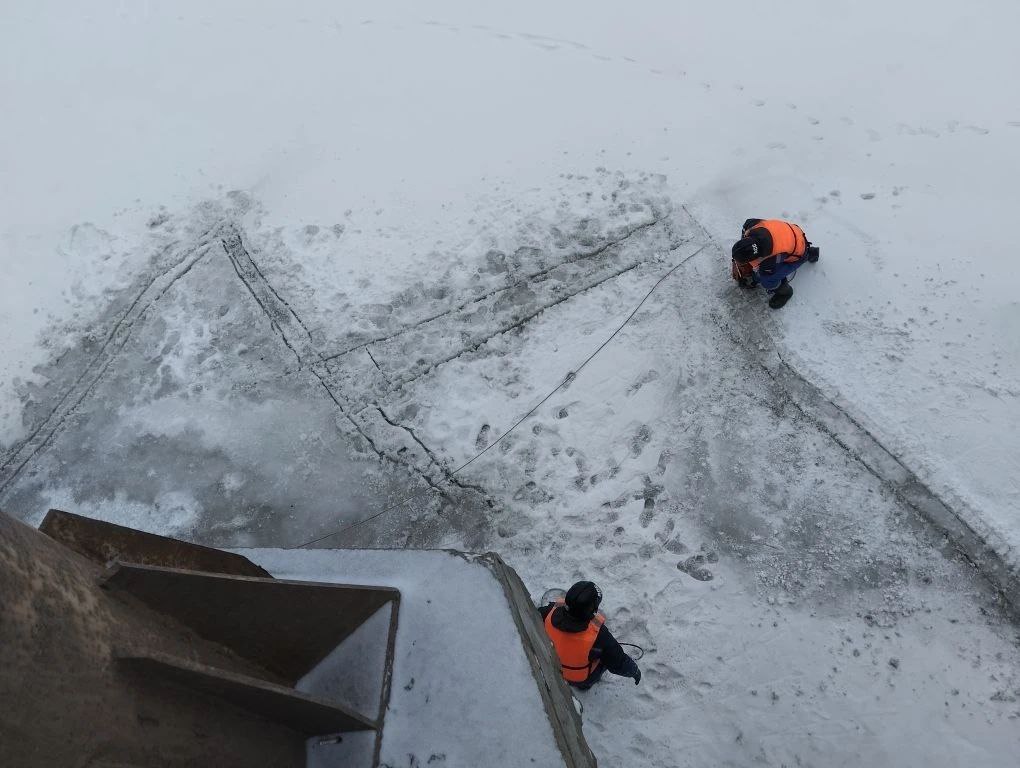 Специалисты с помощью бензопил нарезали толстый ледяной панцирь на фрагменты, чтобы предотвратить возможные проблемы во время таяния - теперь льдины смогут беспрепятственно пройти под мостовыми опорами.