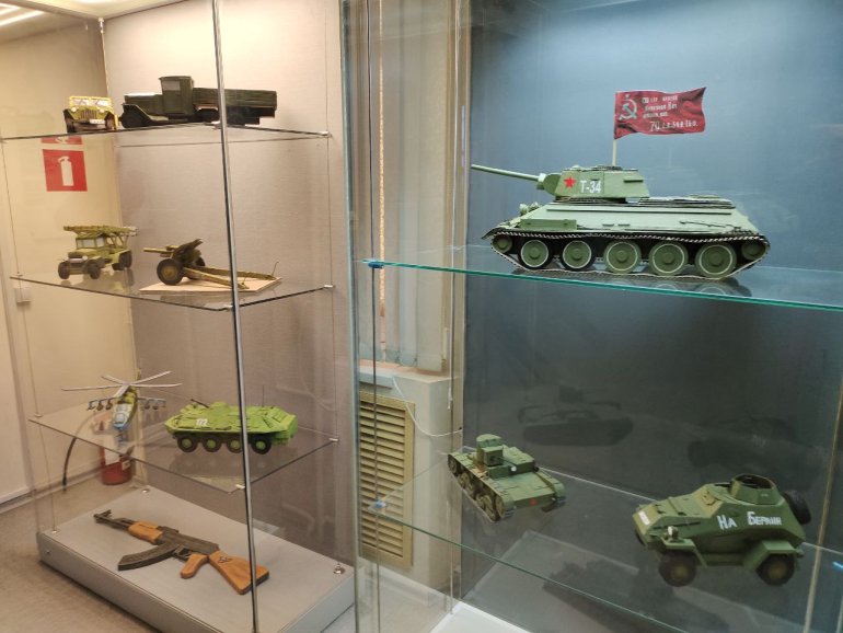 Вторая - выставка макетов оружия периода Великой Отечественной войны. 2025 год, объявленный годом Защитника Отечества и 80-летия Победы, вдохновил художника музея Виталия Варламова на подготовку серии макетов военной техники, как напоминание о тех суровых днях.