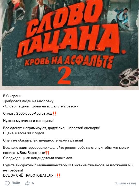Аналогичные сообщения о поиске массовки были обнаружены в пабликах городов Ангарск, Уфа, Миасс, Ухта и других городах. Стоит отметить, что пока что нет официальных сведений о начале съёмок ни от онлайн-кинотеатров, ни от режиссёра сериала «Слово пацана» Жоры Крыжовникова. К слову, в настоящем «Слове пацана» одну из главных ролей сыграла уроженка Сызрани Елизавета Базыкина.