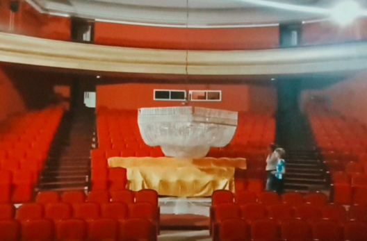 В драматическом театре Сызрани спустили с потолка главную люстру зрительного зала. Процесс сняли на видео, которое театр разместил в социальной сети. Люстру диаметром 5 метров, высотой 2 метра и весом 500 килограммов плавно спустили с 12-метровой высоты в партер.