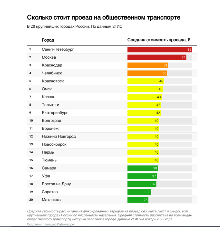 Сервис 2ГИС рассчитал среднюю стоимость проезда на общественном транспорте по фиксированным тарифам и сравнил по этому показателю 20 крупнейших городов страны.