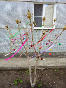 Люди развесили на ветвях крашенные яйца и добавили яркие ленты.