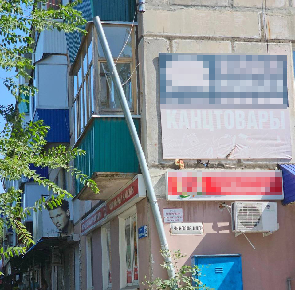 Конструкция с торца здания переломилась на пятиметровой высоте и накренилась с критическим углом. Труба держится что называется на «добром слове», а если быть точнее - на проводах, именно они задерживают падение.