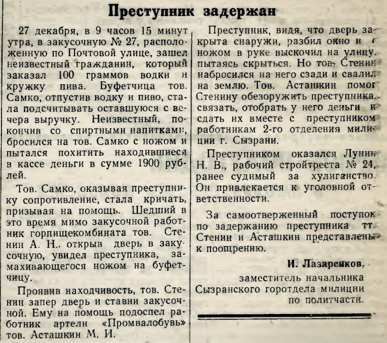 Труженик стройтреста с утра пораньше употребил любимый алкогольный коктейль в закусочной, а потом попытался украсть выручку из буфета и напал на буфетчицу с ножом. Заметка с историей этого грабежа вышла в газете «Красный Октябрь» 15 января 1956 года. - пишет тг-канал «Вспомнить Сызрань».