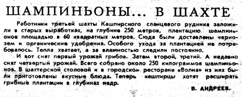 - И вот снят первый урожай грибов. Затем второй, третий. А недавно снят четвертый урожай. Всего собрано около 250 килограммов шампиньонов. В шахтерской столовой и в городском ресторане «Волна» из них были приготовлены вкусные блюда. Теперь кашпирцы хотят расширять грибные плантации в глубинах недр, - заключил автор публикации.