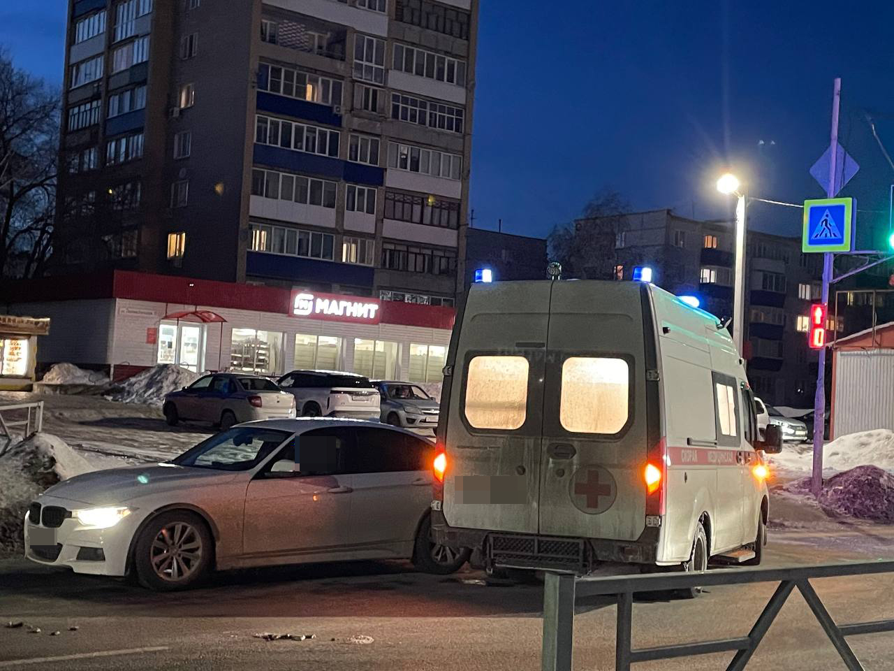 ДТП произошло рядом с регулируемым пешеходным переходом. Судя по фото, скорая поворачивала налево и врезалась в едущий прямо немецкий седан. В результате транспортные средства перекрыли полосу движения. Информация о пострадавших пока не поступала.
