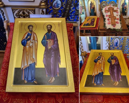 Икона с изображением Петра и Павла выполнена на доске, на сусальном золоте и в прошедшее воскресенье икону по всем правилам освятили во время службы в храме.