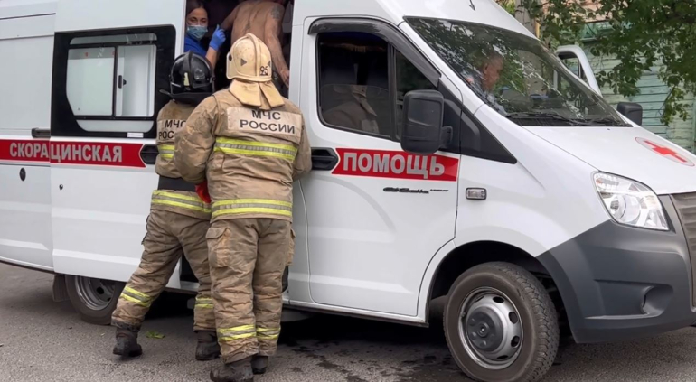 Во время тушения из дома под руки пожарные вынесли голого по пояс мужчину. Предварительно - это хозяин дома, где случилось возгорание. Медики оперативно погрузили человека в автомобиль скорой и после осмотра увезли в больницу.