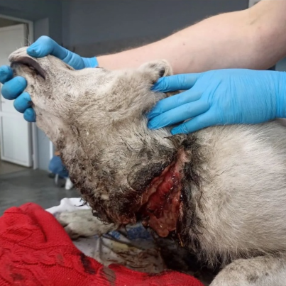 Измученное животное было доставлено к ветеринарам для проведения операции. По словам специалистов, собака находится в крайне истощённом состоянии. На фотографиях можно заметить глубокую рану на шее спереди, из которой виднеется мясо.