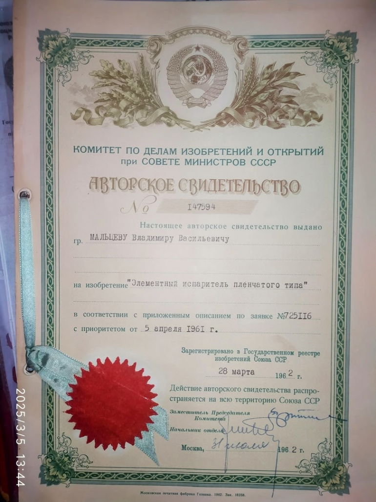 Владимир Васильевич был удостоен высокой награды «Изобртатель СССР» за технические достижения, но со временем знак оказался утерян. К счастью, сохранились все документы, подтверждающие право на награду.