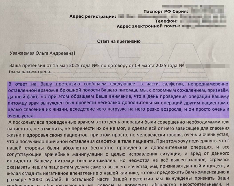 Женщина направила клинике официальную досудебную претензию. Ей ответили, что «врач был уставший». Ответ не устроил хозяйку, и она направила вторую претензию.