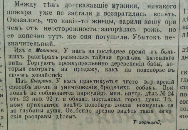 В издании времен императора Николая II «Самарская газета» обнаружили то, о чем жители Сызрани и региона жаловались властям более 100 лет назад. В номере, вышедшем 15 июля 1903 года, сообщается об убийстве животных в Сызрани.