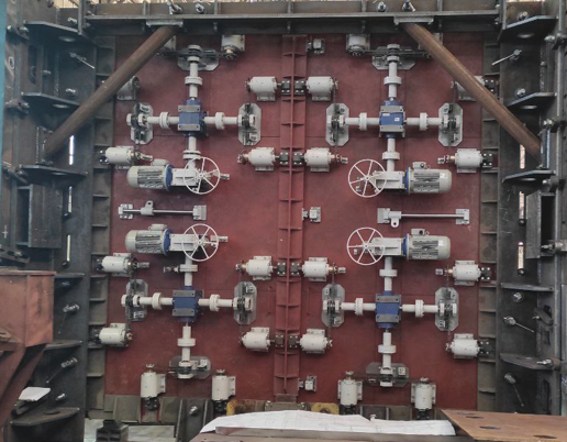 На каждом полотне ворот установлено два мотор-редуктора и двенадцать прижимных блоков с цепным механизмом. Они приводят в движение клинья, которые надежно прижимают полотна к раме и запирают ворота. Для ручного управления на каждом мотор-редукторе есть дублирующий привод с рукоятью-штурвалом.