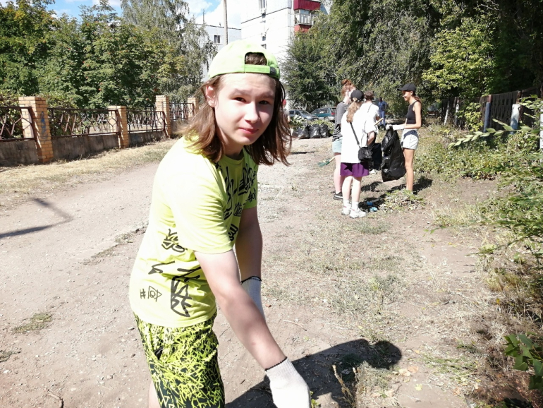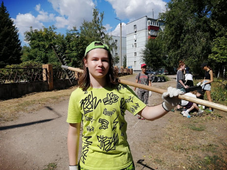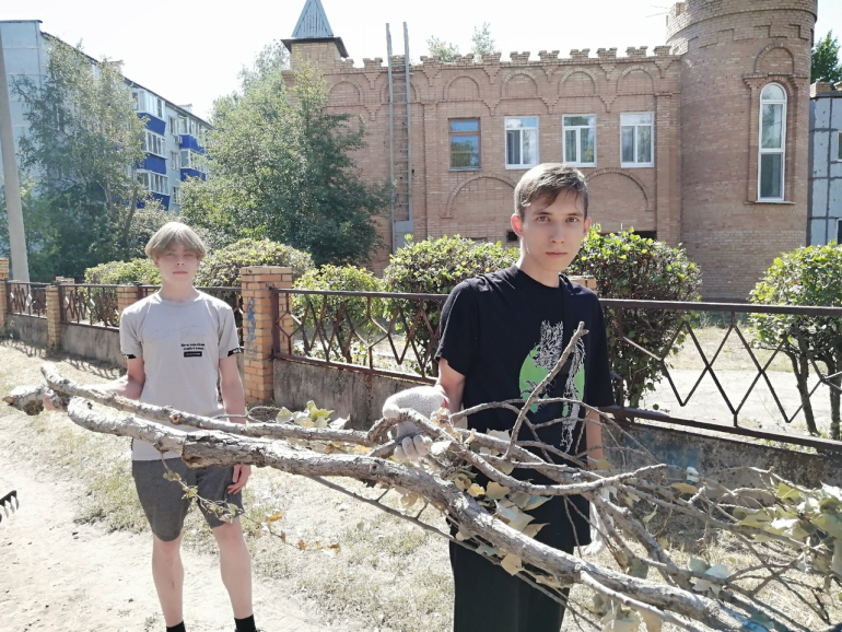Анна и еще два десятка подростков трудоуcтроились с помощью ТОС «Монгора». Юноши спиливают дикий кустарник у забора 17-ой школы; девушки работают граблями и все вместе готовят к отгрузке кучи веток, листвы, травы. Вдобавок они убирают детские и спортивные площадки во дворах, а потом на них же помогают проводить конкурсы для детворы.