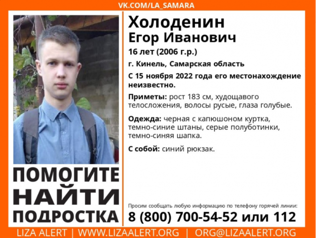 Родные, волонтеры и правоохранители Самарской области ищут 16-летнего подростка. Егор Холоденин из Кинеля пропал 15 ноября, до сих пор о его судьбе ничего не известно. Об этом сообщают активисты добровольческого отряда «Лиза Алерт».