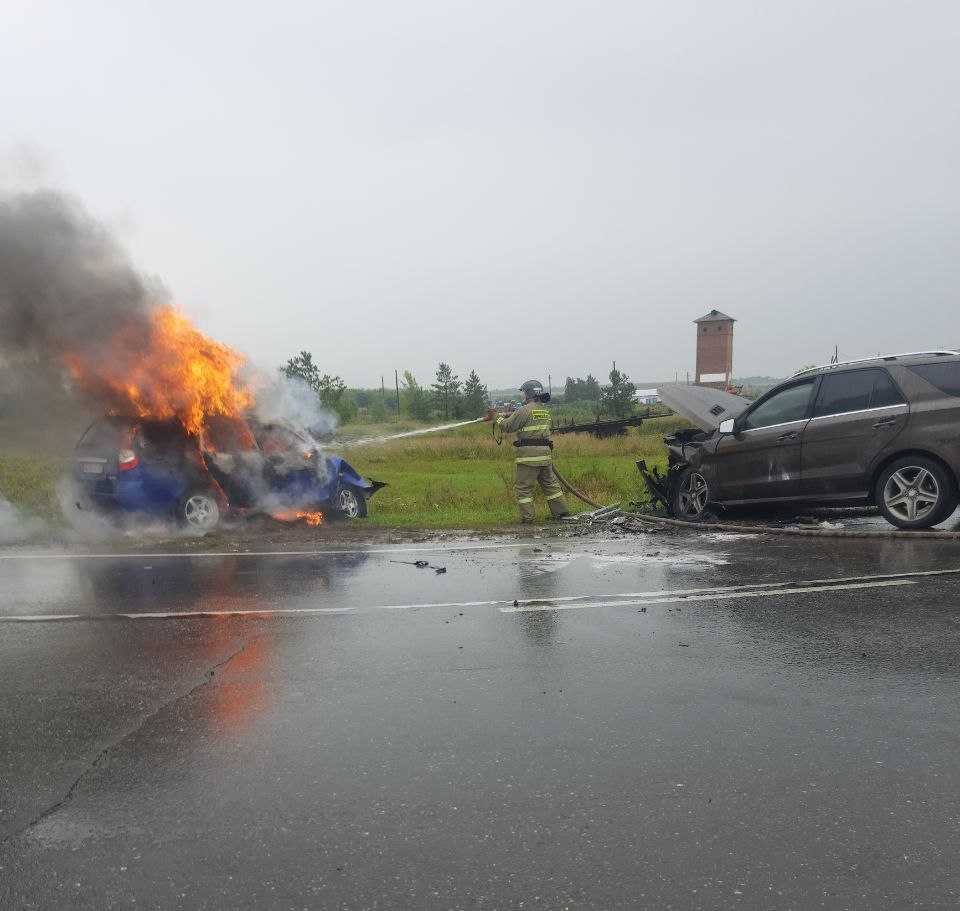 Центр по делам ГО, ПБ и ЧС сообщает, что на 35-ом километре автодороги «Отрадный – Богатое – Борское» произошло лобовое столкновение двух автомобилей: Mercedes и Lada Priora. От удара одно из машин загорелась.