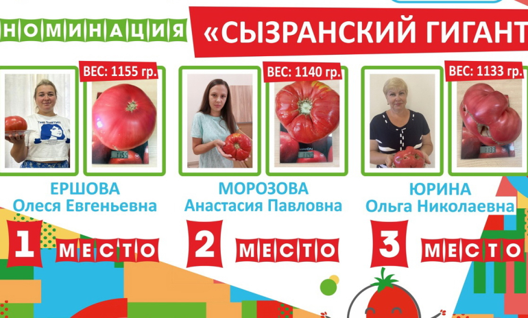 Второе место в Сызрани заняла Анастасия Морозова с помидором массой 1,140 кг. Третий гигант на Сызранском празднике потянул на 1,133 кг. Этот помидор принадлежит Ольге Юриной. Победителям вручили сертификаты на ценные подарки.