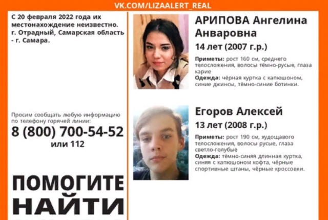 В Самарской области пропали 14-летняя Арипова Ангелина и 13-летний Егоров Алексей. Об этом 22 февраля сообщили в поисково-спасательном отряде «ЛизаАлерт». С 20 февраля 2022 года местонахождение подростков неизвестно.