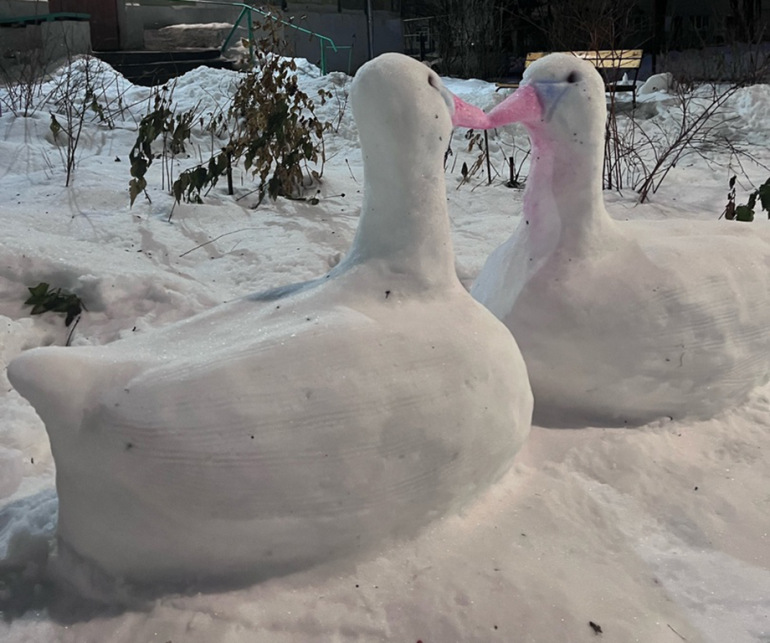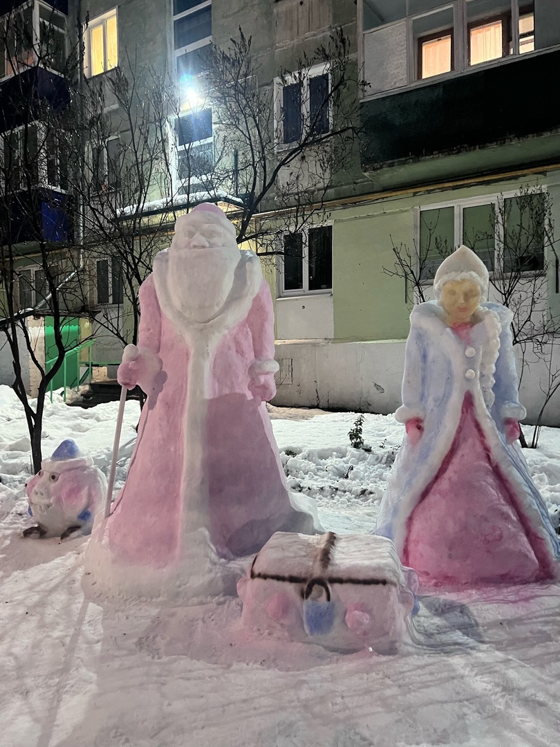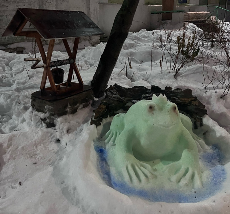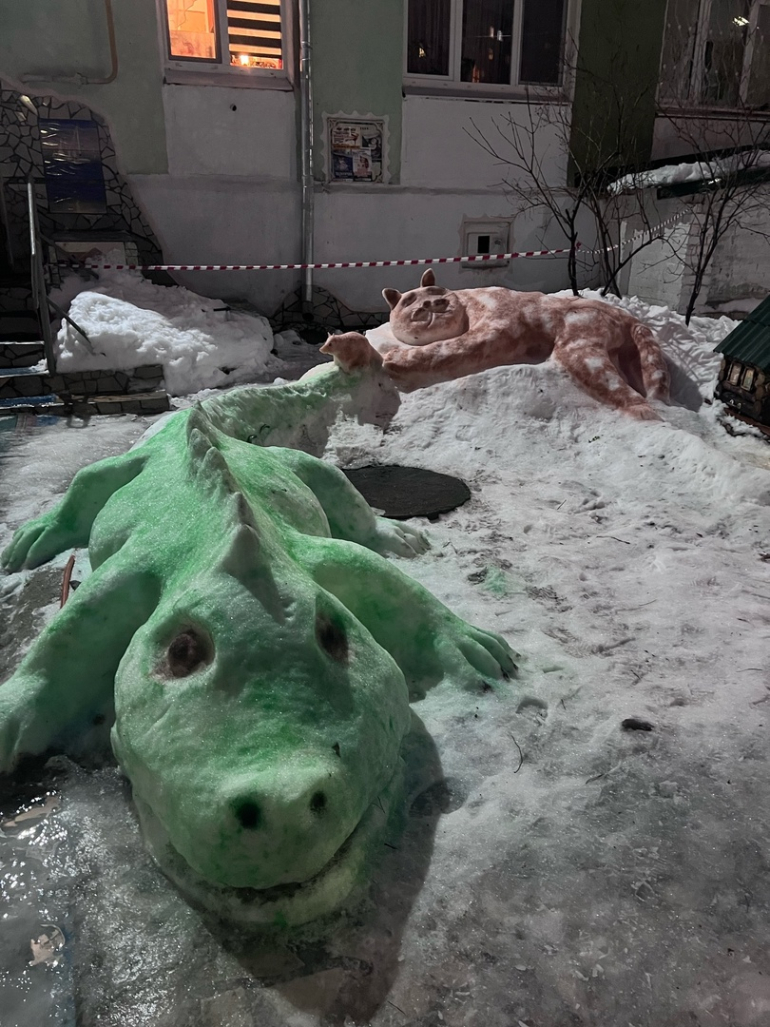 После сильного снегопада наступила оттепель, которая сделала снег идеальным материалом для снежных скульптур. В преддверии Нового года люди решили подарить себе и соседям праздничное настроение. На площадке перед домом появились дед Мороз и Снегурочка, царевна-лягушка, белочка с орешками из «золота». Рядом расположились лебеди, медведь и кот.
