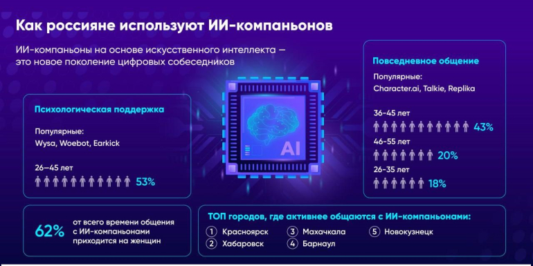 С ИИ-компаньонами чаще всего взаимодействуют россияне в возрасте 36–45 лет (43%), за ними идут группы 46–55 (20%) и 26–35 лет (18%). А вот сервисы психологической поддержки чаще выбирают те, кому от 26 до 45 лет (53%). Женщины активнее вовлечены в общение с цифровыми собеседниками (57%), и на них приходится 62% от всего времени, которое абоненты беседуют с ИИ-ботами.