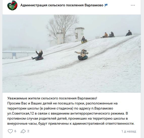 Какая ответственность грозит за катание с горок у школы - не уточняется. Остальные горки в поселке, видимо, прошли проверку на благонадежность. Ну а пока детям предстоит гадать, куда теперь идти за порцией зимнего веселья, чтобы не быть наказанными.